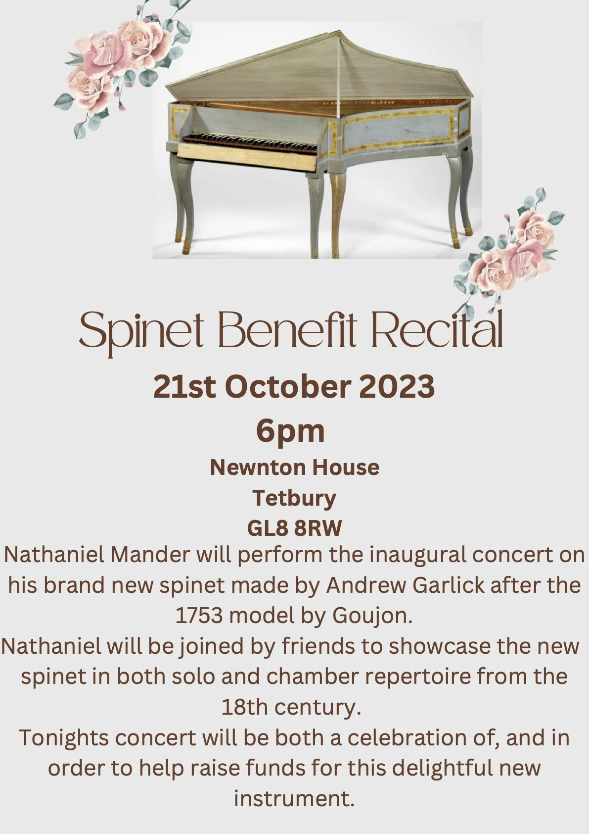 Inaugural Spinet Recital Saturday 21 October 2023 18:00 19:00 Newnton House Tetbury (map) Google Calendar ICS Nathaniel will be giving the first recital on his newly commissioned spinet; a copy of the Goujon 1753 original that lives in the Musée Instrumental in Paris.